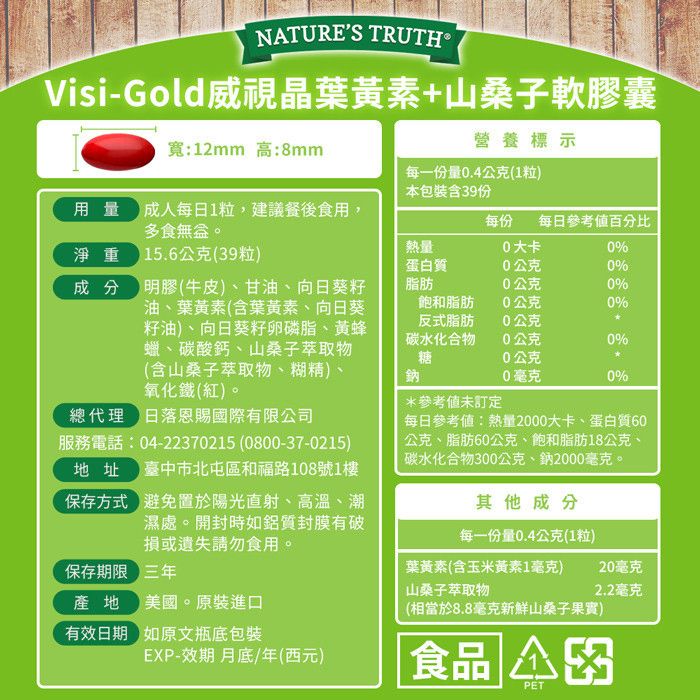 綠萃淨 Visi-Gold威視晶葉黃素+山桑子軟膠囊(39粒/瓶)