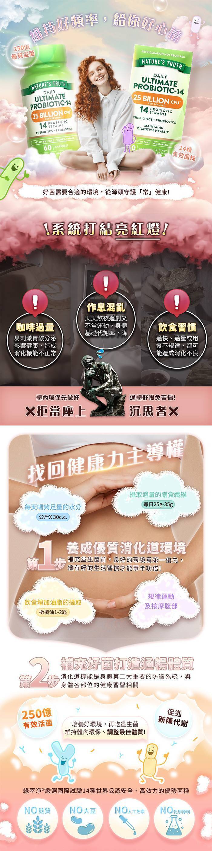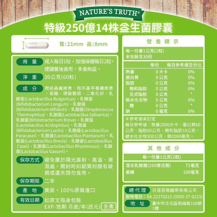 商品詳情 ★高達250億的活性益生菌 ★嚴選14種國際優勢菌種 ★益生菌(Probiotic)+菊糖益生元(Prebiotic) ★由內而外窈窕順暢,增加自信美 ★不含人工香味、人工色素 綠萃淨 特級250億14株益生菌膠囊x5瓶組(共300粒) TWD $4,990 TWD $4,990