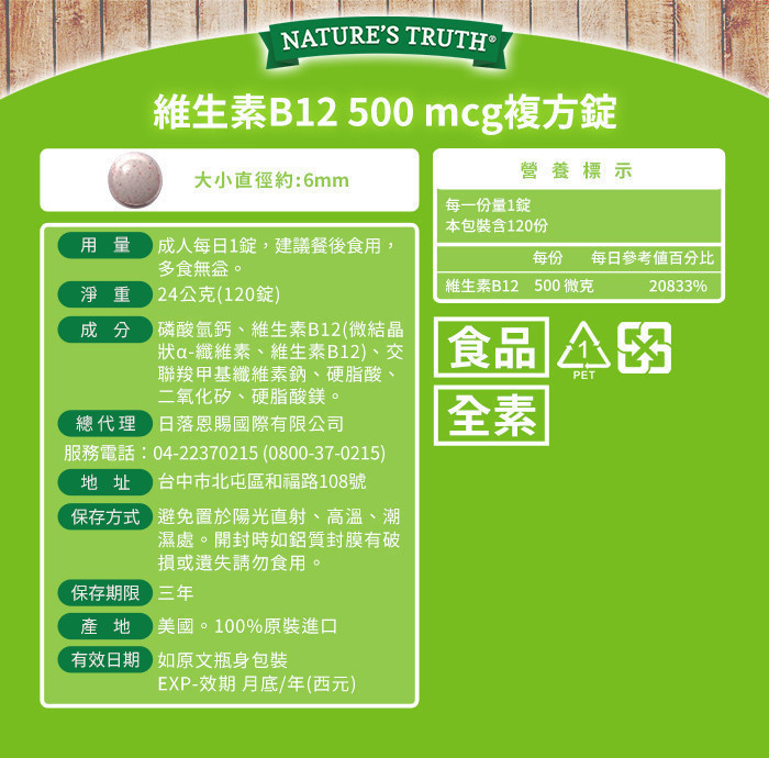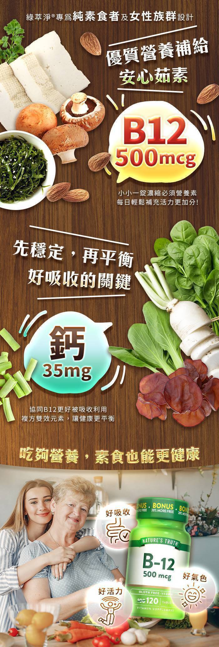 商品詳情 ★高純度B12-500微克營養素 ★添加鈣35毫克更好吸收 ★純素配方,適合素食者 ★穩定平衡整體健康 綠萃淨 維生素B12 500mcg複方錠x5瓶組(共600錠) TWD $1,990 TWD $1,990