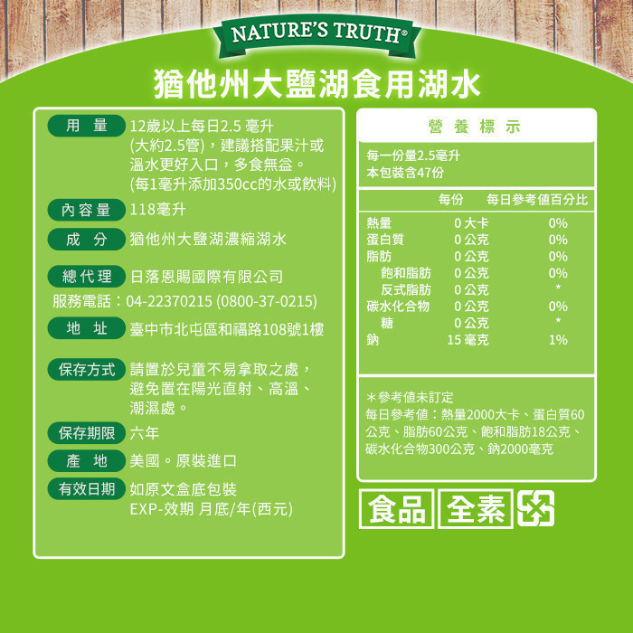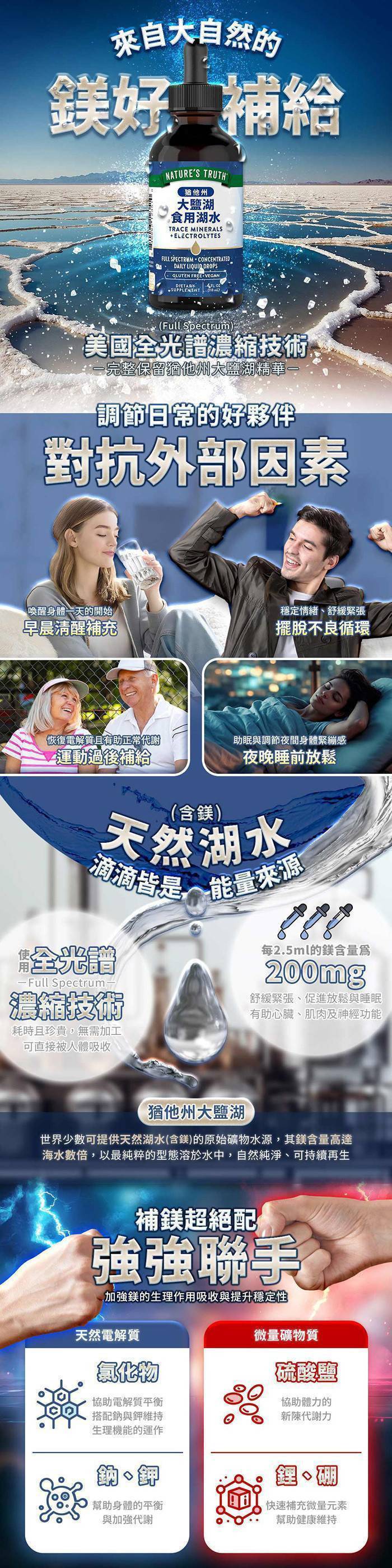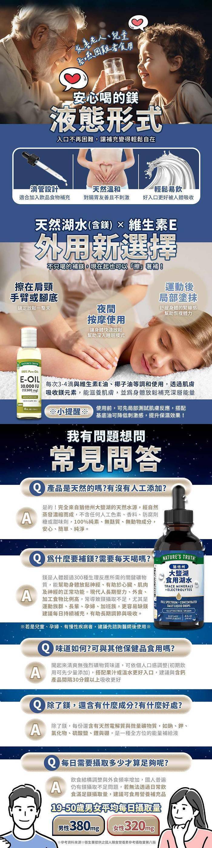 商品詳情 ★使用全光譜濃縮技術 ★內含天然電解質與礦物質的精華 ★液態形式更好入口 ★可外用,配合E油調合塗抹讓身體放鬆 維生素E全效滋潤護膚油 綠萃淨 猶他州大鹽湖食用湖水(鎂)x5瓶組(共590ml) TWD $2,890 TWD $2,890