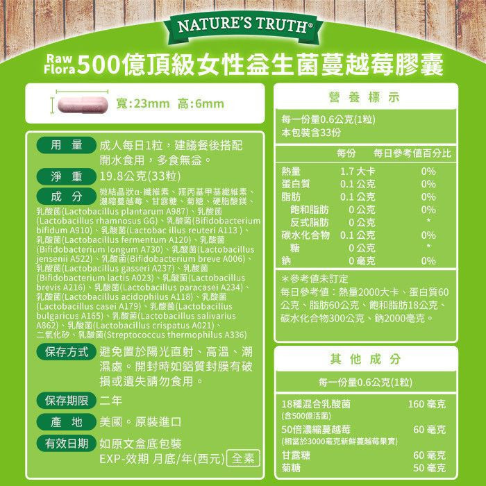 商品詳情 ★獨特醫生配方、國際臨床菌株編號 ★18種益生菌、專為女性打造優質體質 ★每粒含有500億活性益生菌 ★50倍濃縮蔓越莓萃取物精華 ★添加甘露糖、菊糖,幫助益生菌定殖 ★美國原裝進口、符合GMP生產規範 綠萃淨 Raw Flora 500億頂級女性益生菌蔓越莓膠囊x5瓶組(共165粒) TWD $7,490 TWD $7,490