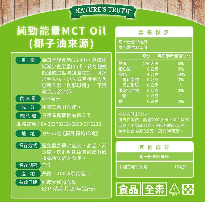 商品詳情 ★美國原裝進口精純MCT Oil ★純淨能量維持、活力滿滿 ★防彈咖啡必備油品,增加飽足感 ★標準中鏈油脂C8、C10,完美比例6:4 綠萃淨 純勁能量MCT Oil(椰子油來源)x5瓶組(473ml/瓶) TWD $2,990 TWD $2,990